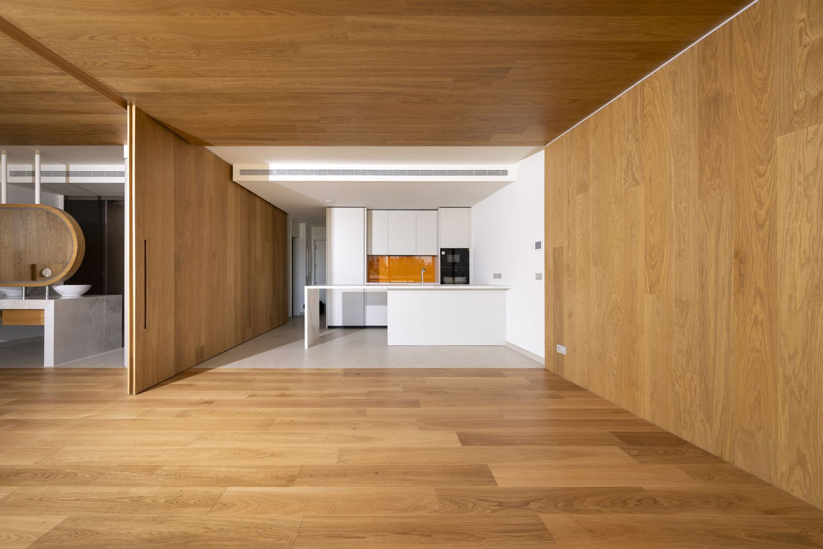 L'un des éléments de design les plus remarquables est le système de cloisons coulissantes de la chambre principale, qui permet d'ouvrir l'espace sur le salon, créant ainsi une ambiance loft élégante et ouverte, ou une intimité totale selon les besoins.