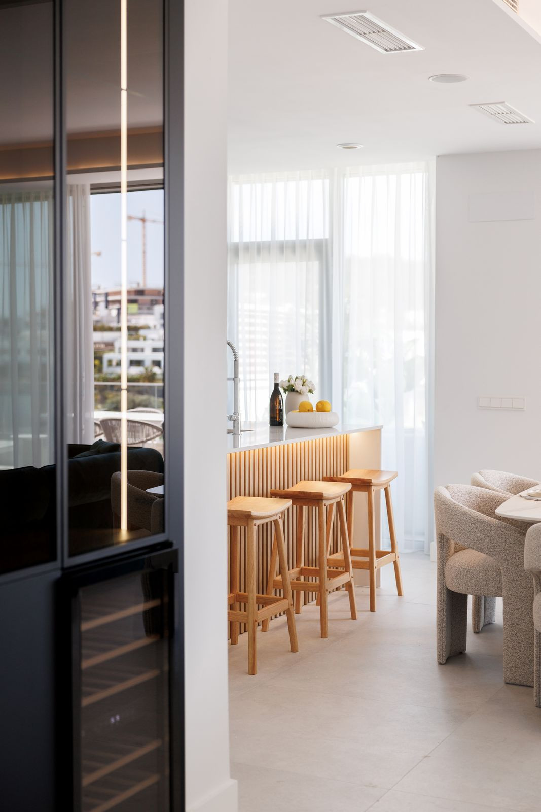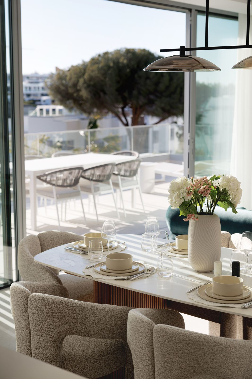 Le véritable atout de ce penthouse réside dans ses impressionnantes terrasses de 128 m², conçues pour la détente et les réceptions. Elles comprennent une piscine privée, d'élégants espaces lounge, un coin repas extérieur couvert et offrent une vue imprenable sur des jardins paysagers et une architecture moderne. Orientées à l'est, elles bénéficient d'une douce lumière matinale et de températures agréables tout au long de la journée, permettant ainsi de profiter des espaces extérieurs en toute saison.