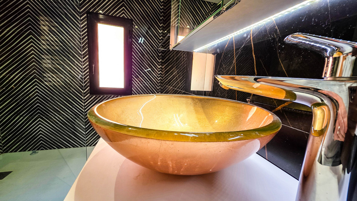 De larges portes coulissantes s'ouvrent sur une terrasse couverte équipée de baies vitrées, permettant d'en profiter toute l'année tout en savourant pleinement la vue panoramique sur la mer. Qu'il s'agisse de dîner, de se détendre ou de travailler à domicile, la terrasse devient un précieux prolongement de l'espace de vie intérieur.