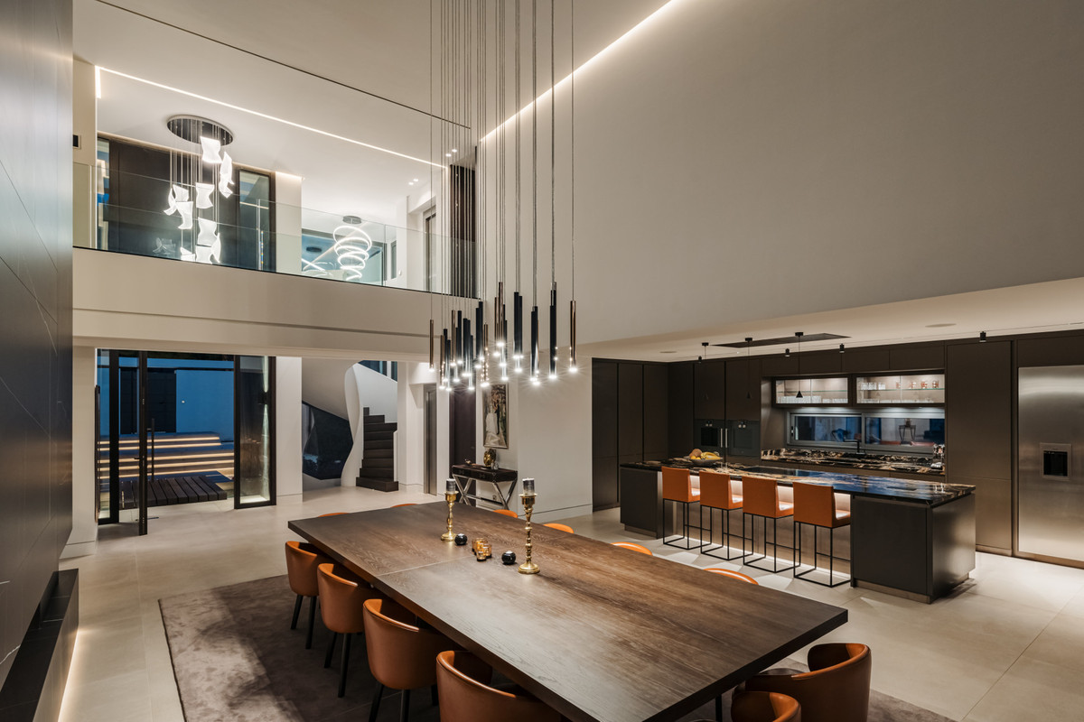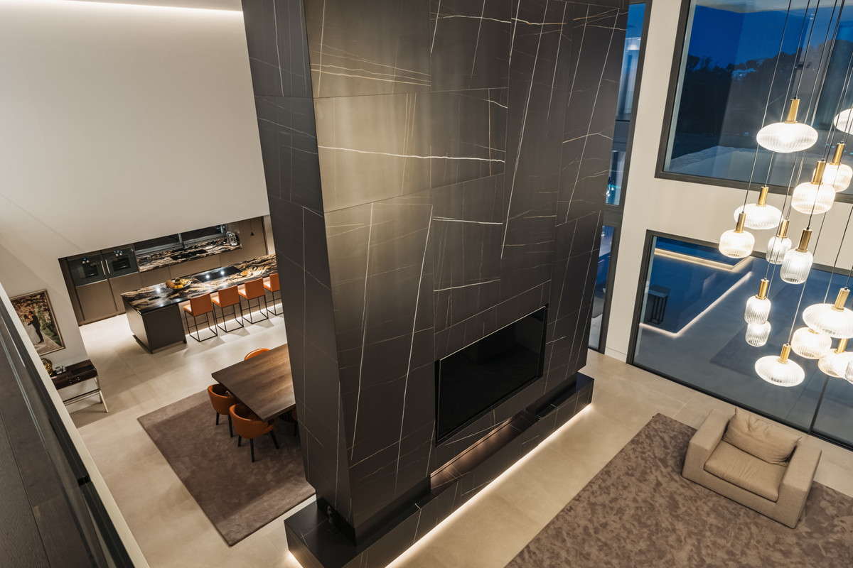 La villa dispose d'une cuisine contemporaine entièrement équipée, ouverte sur une salle à manger spacieuse. Ces deux espaces, ainsi que le salon lumineux, bénéficient d'une abondante lumière naturelle grâce à de grandes baies vitrées, créant ainsi une configuration harmonieuse et bien définie. Une élégante cheminée apporte chaleur et charme à l'ensemble. Conçue pour un confort optimal, la maison comprend également un sous-sol aménagé avec sauna privé, piscine intérieure, salle de sport, solarium et salle de cinéma : un véritable havre de paix dédié au divertissement et au bien-être.