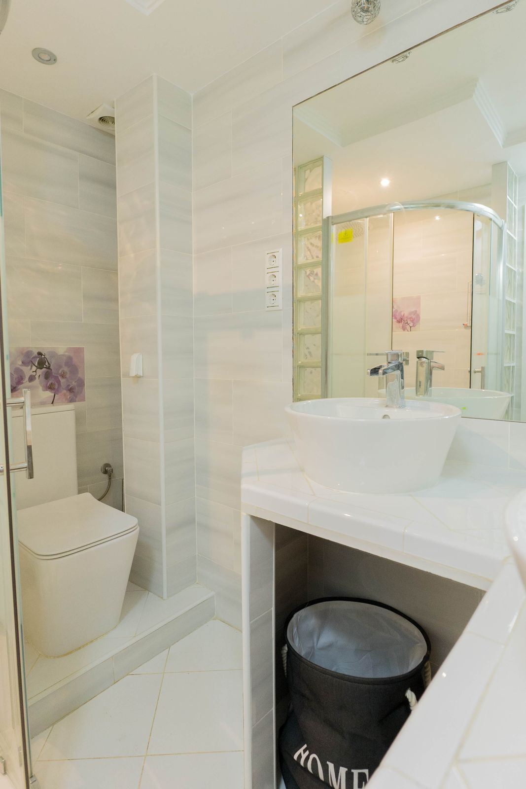 Elle comprend également une salle de bain complète moderne au design fonctionnel, ainsi qu'un espace buanderie équipé d'un lave-linge et d'un sèche-linge.