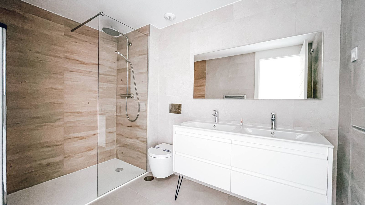 Cuisine entièrement équipée avec appareils Bosch, sols en grès cérame, fenêtres panoramiques à haut rendement énergétique, volets roulants électriques et système de climatisation aérothermique.