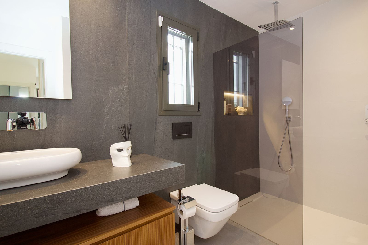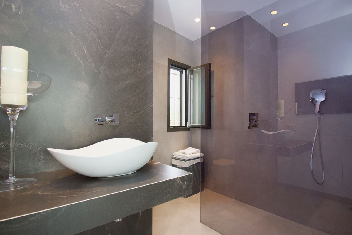 L'espace extérieur a été aménagé avec le même souci du détail. Devant la villa, une superbe piscine à débordement offre une vue spectaculaire et est agrémentée d'une élégante cuisine d'été, idéale pour recevoir ou profiter de douces soirées sous le ciel andalou. La piscine, le bar et le jardin sont magnifiquement illuminés, créant une atmosphère magique et raffinée à la nuit tombée.