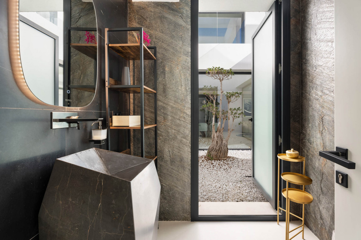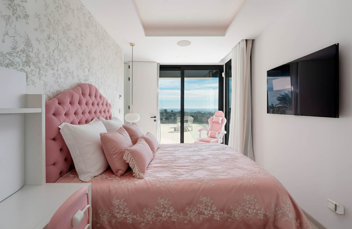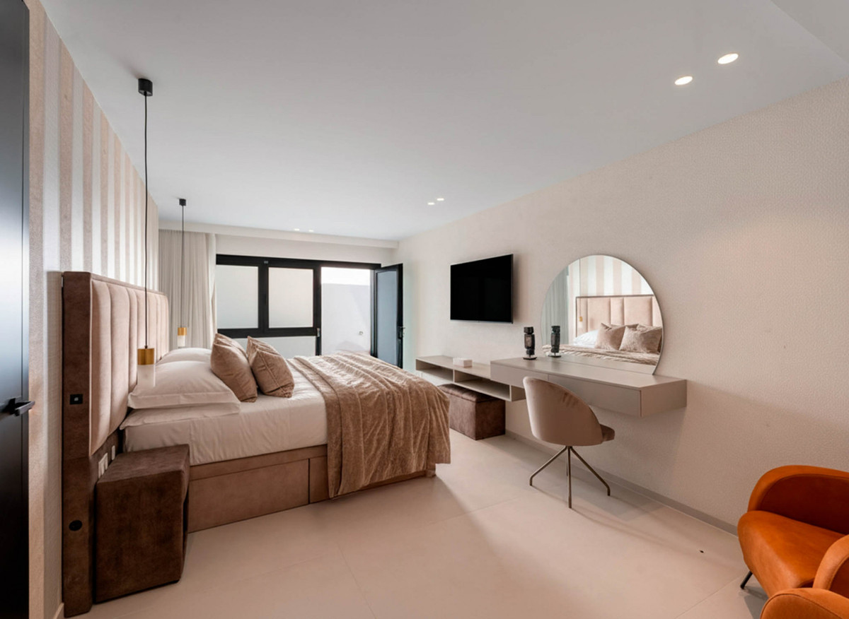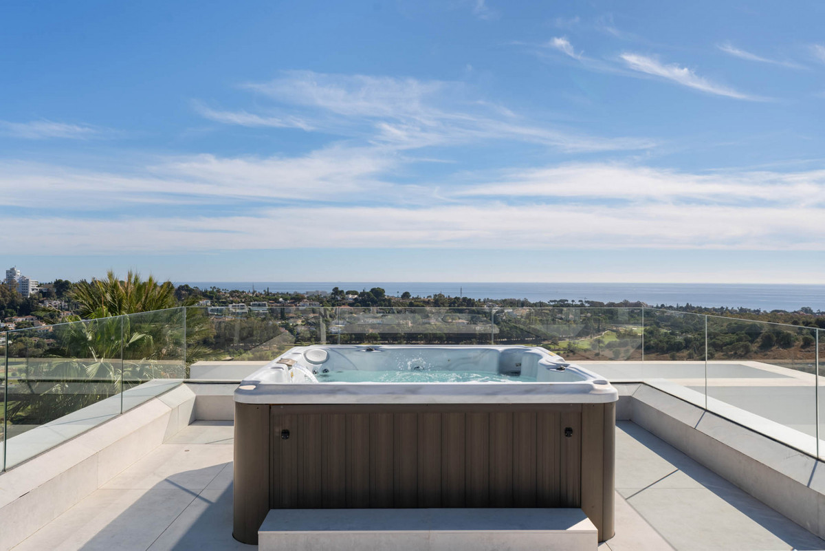 La villa comprend six chambres, chacune dotée d'une salle de bains privative conçue pour un confort optimal et une intimité préservée. La suite principale offre une vue sur la mer et un accès à une terrasse privée. À l'étage, un solarium avec jacuzzi offre une vue panoramique imprenable s'étendant du golf jusqu'à l'Afrique, créant ainsi un espace privilégié pour admirer le paysage environnant depuis le point culminant de la propriété.