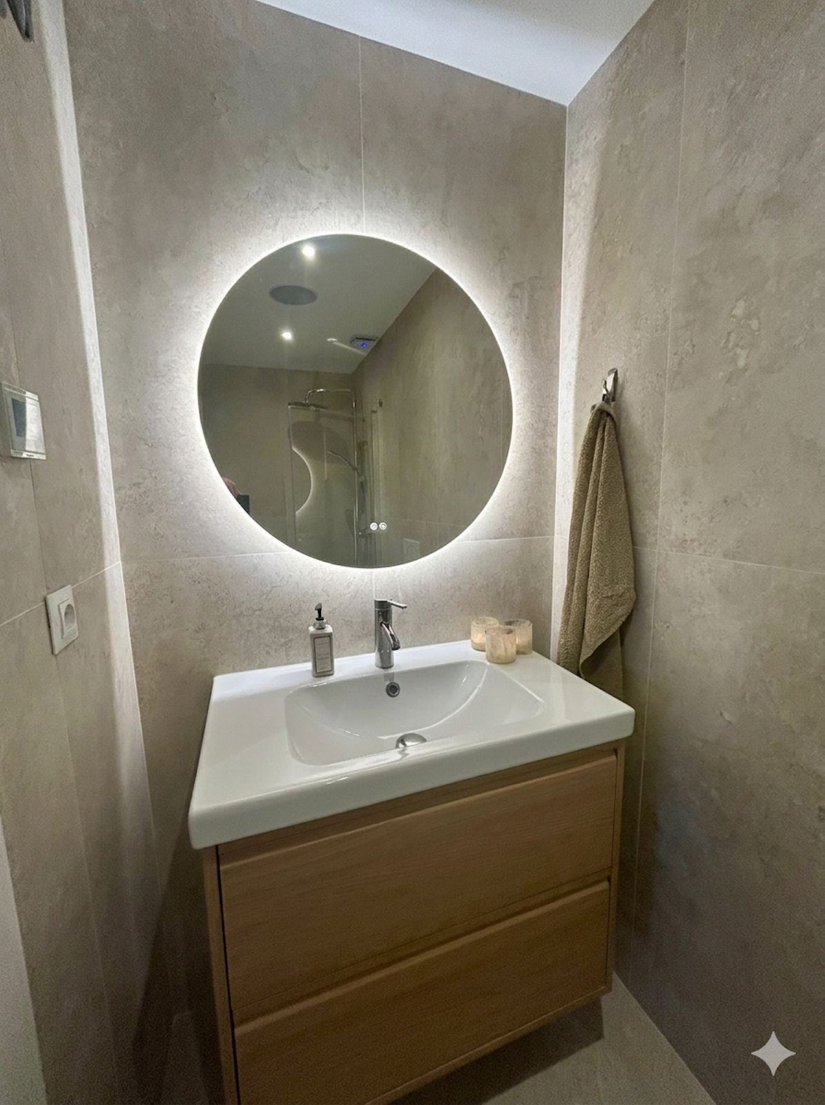 La troisième chambre, située au rez-de-chaussée, bénéficie d'une entrée indépendante et d'une salle de bains moderne avec chauffage au sol, douche à l'italienne, parois de douche en verre, étagères encastrées et spots. Parmi les autres atouts, citons une terrasse sur le toit, plusieurs balcons et terrasses, un sol en marbre, des finitions intérieures claires, un système de caméras Ring et un lave-linge récemment installé.